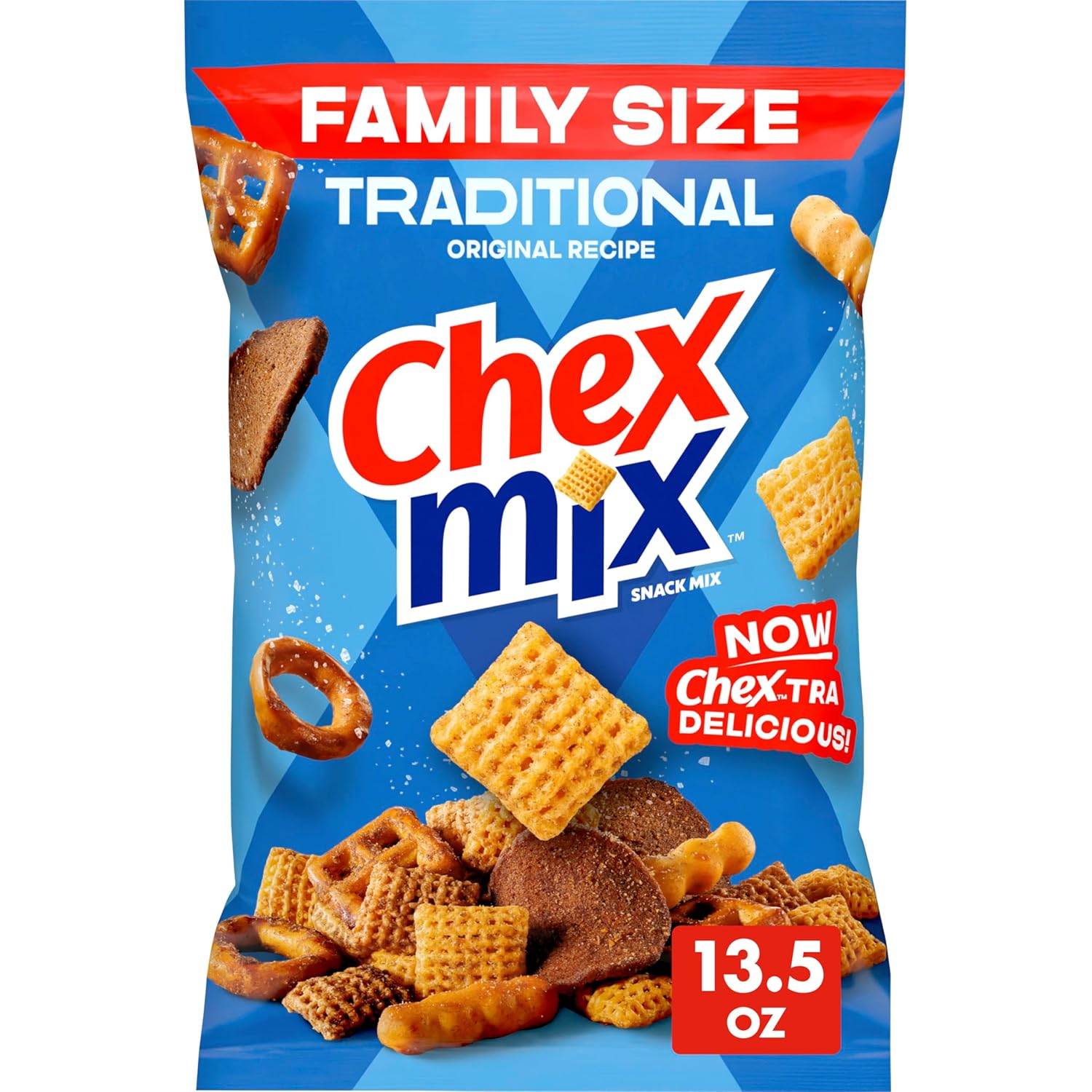 • CONTAINS: One 13.5 oz Family Size bag of Chex Mix Traditional Original Recipe Snack Mix