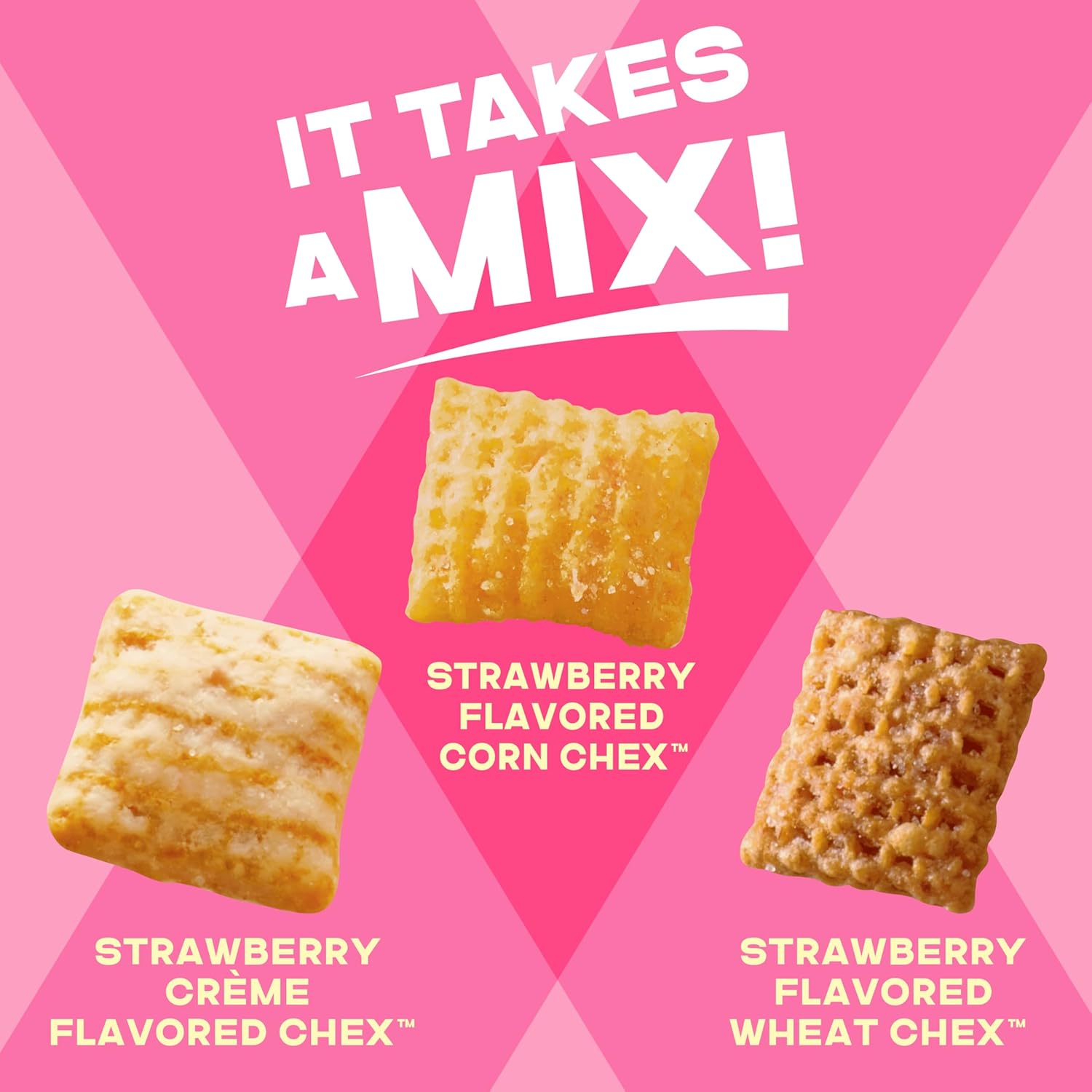 - CRUNCHY LITTLE BITES: Enjoy three different Chex pieces. including Strawberry Cr??me Flavored Chex with a deliciously creamy coating